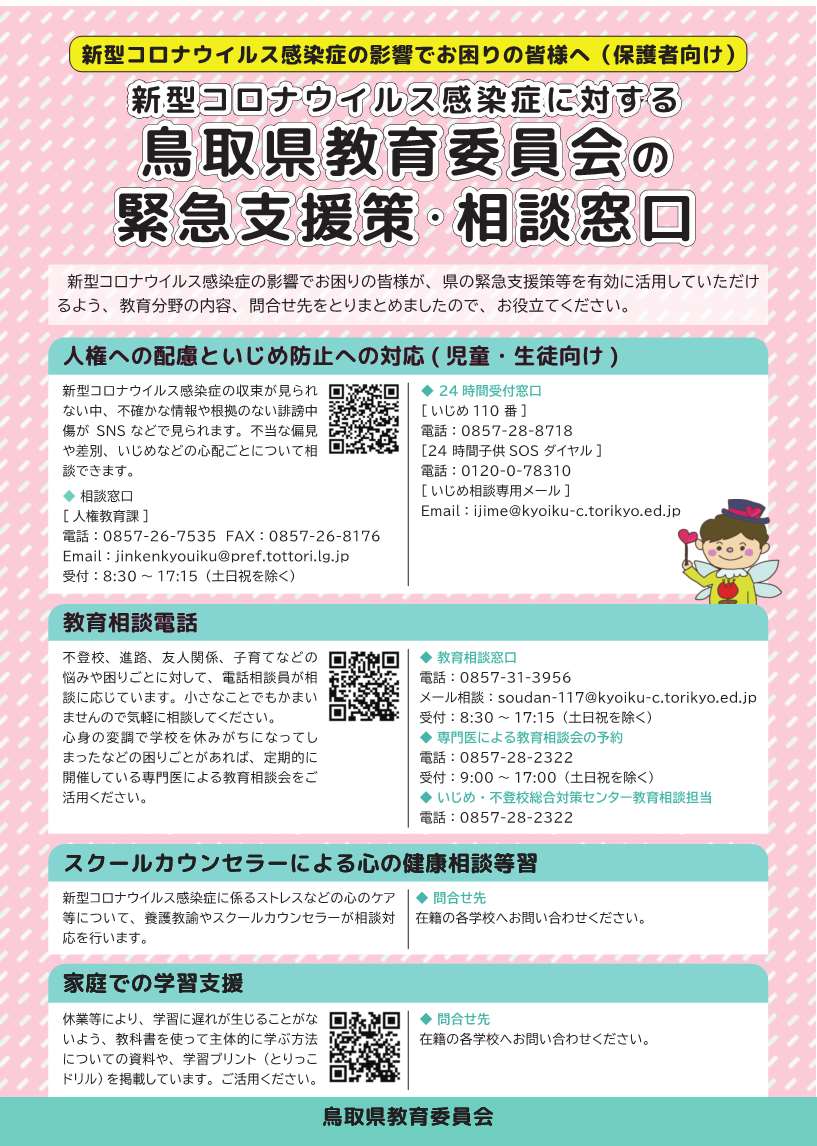 添付のとおり、注意喚起チラシが更新されました。鳥取県内においても変異株(デルタ株)への置き換わりとともに、家庭内感染を含む児童生徒の感染が増えており、今まで以上に危機感を持って対応する必要があります。最大限の注意と、基本的な予防対策の徹底をお願いします。