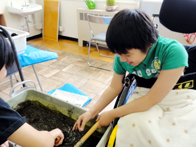 | フルーツ白玉作りをしました。施設の利用者の方から白玉の生地をもらい、お母さんと一緒にこねました。しっかりと感触を感じ、目を開けてやるきいっぱいに取り組みました。 |