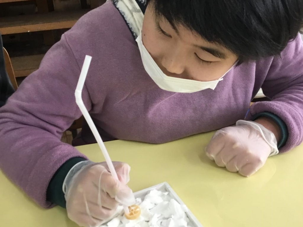 小学部1,2,3組の児童が多目的ホールに集まって、クリスマスに関連した絵本の読み聞かせを聞いたり、クリスマスの歌を歌ったり、点灯したイルミネーションを楽しんだりしました。絵本の読み聞かせは静かに聞き入っていました。また、イルミネーションはその場で寝転がり、鮮やかな光を静かに見入っていました。後日、イルミネーションを設置してくださった米子市管工事業協同組合の皆様へお礼の手紙やこの時の様子を描いた絵等を渡すことにしています。