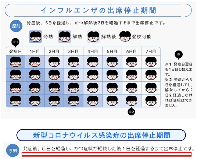 学校感染症(水ぼうそう、おたふくかぜ、溶連菌感染症、インフルエンザ、新型コロナウイルス感染症等)の場合、「出席停止」となります。診断されましたら、すぐに学校へご連絡ください。