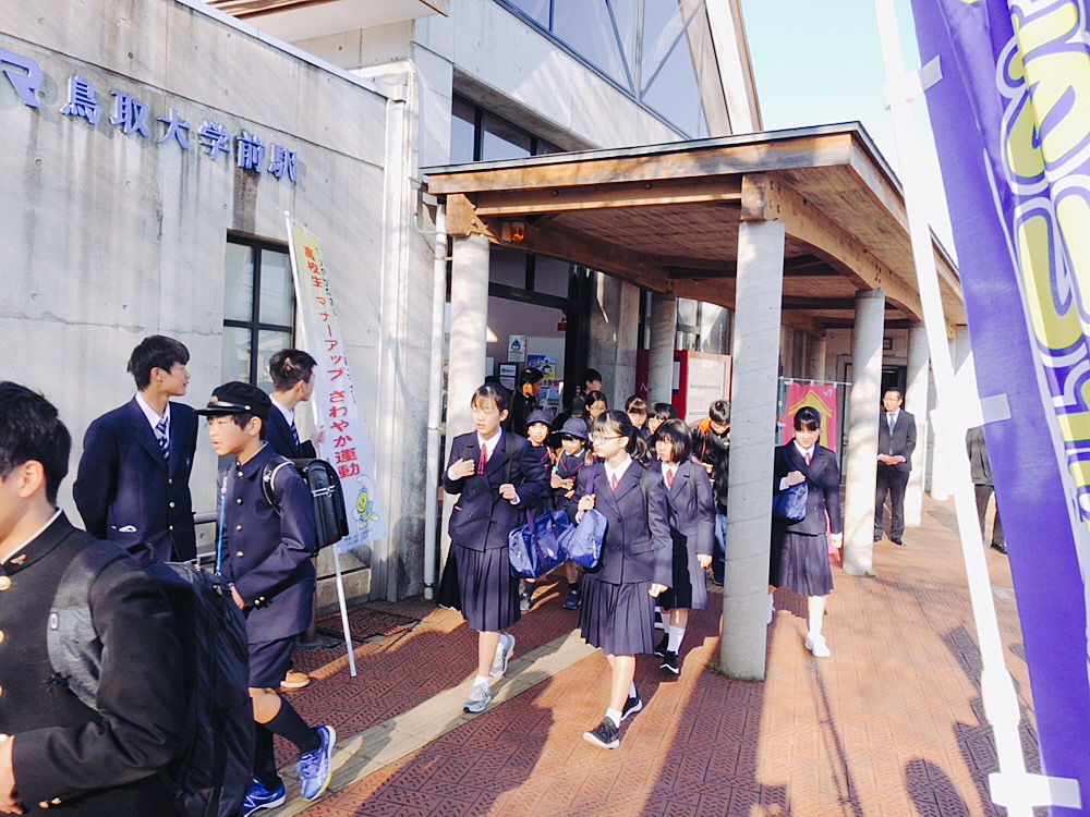 鳥取大学前駅と本校正門に生徒会執行部と職員が立ち、元気に挨拶をしています。