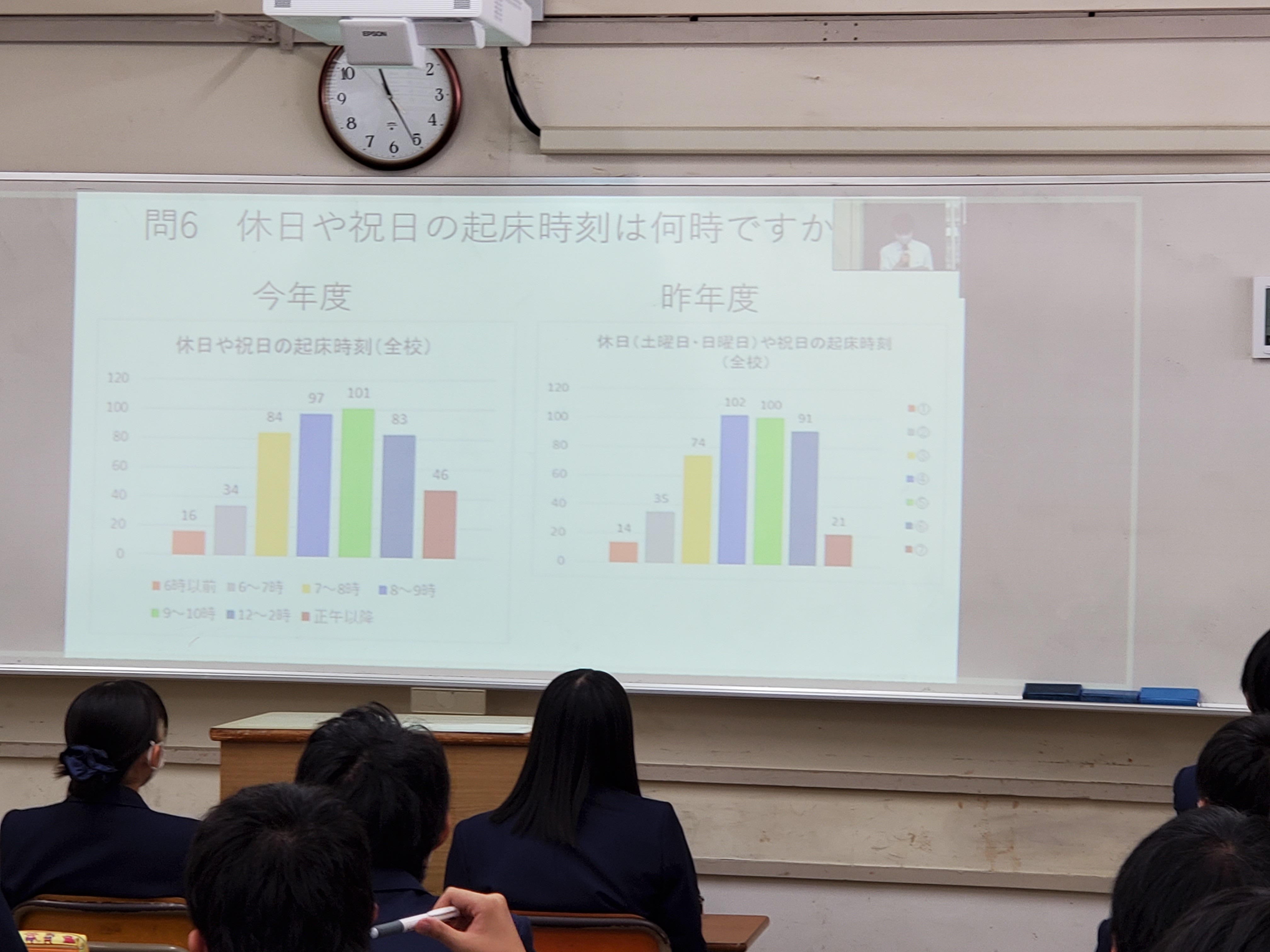 保健委員会が9月2日に全校対象に「生活習慣に関するアンケート」を実施し、アンケート結果から見た本校生徒の健康課題と対策についてパワーポイントを作成して全校生徒に伝えました。併せて、本校の保健体育科の5名の先生方に学生時代の生活習慣についてインタビューを行い紹介しました。