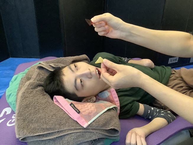 音楽に合わせてタッピング刺激や揺れ刺激を感じると気持ちよさそうな表情や声が聞かれる場面もありました。また、「ひらいたひらいた」の曲に合わせてスカーフを揺らし、曲の終わりに合わせてスカーフから抜け出る活動では両手を使ってスカーフを取ろうとする姿が見られました。