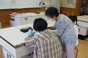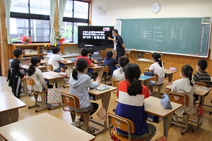 若桜学園では、全部の学年の教室に電子黒板とデジタル教科書が用意されています。2年生の国語の授業では、このデジタル教科書が大活躍をしていました。新しい漢字を習うときに、一画一画がわかりやすいように違う色で表示され、筆順もわかりやすくなっています。何より、先生の陰になってしまうことがないので、どこからでも見やすいのです。はねやとめもチョークで書くよりもわかりやすく、デジタル教科書を使った学習は、子どもにとってとてもわかりやすいと思います。見て学んだあと、自分で漢字を書く時間もしっかりとれるので、本当に電子黒板とデジタル教科書は、便利な機器だと思います。