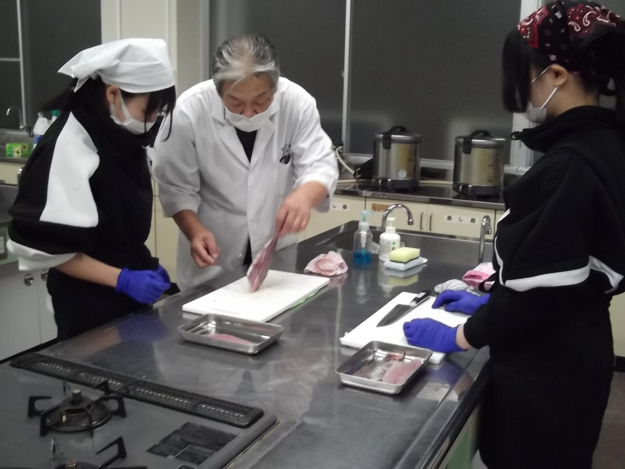 家庭科のフードデザインの授業で、プロの調理師の方を講師に迎え、調理実習をしました。アジのさばき方などを丁寧に教えていただきました。