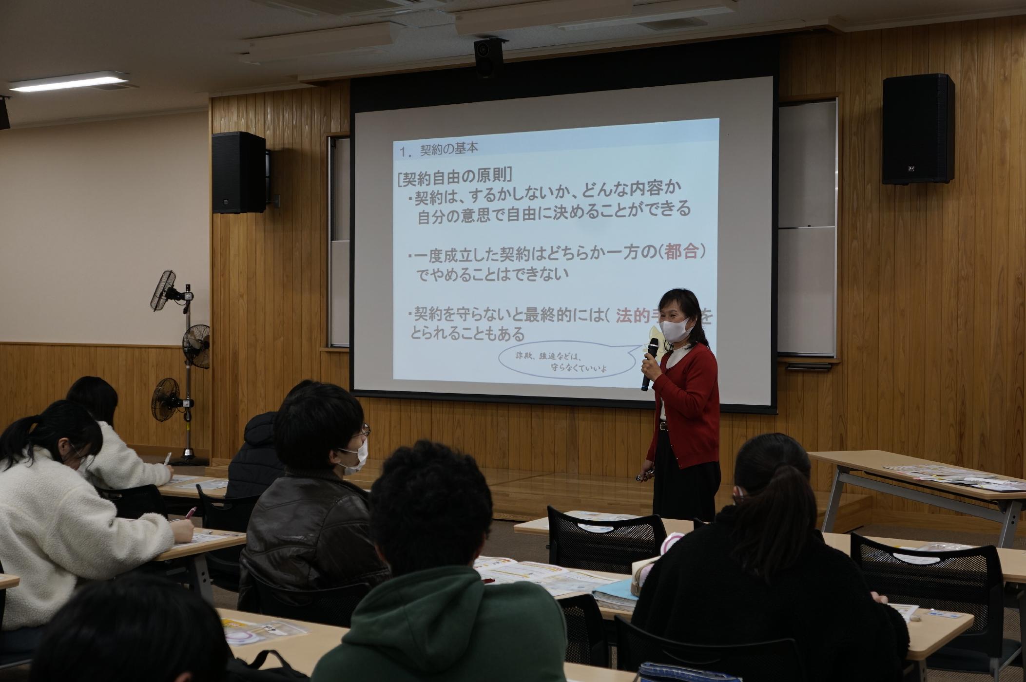 鳥取県金融広報委員会の金融アドバイザー 福田登代子氏を講師に迎え、消費生活についての学習会をしました。契約のこと、詐欺のことなど、これから社会生活をする上で知っておかないといけない大事な内容について分かりやすく教えていただきました。途中、生徒による寸劇もあり、楽しい雰囲気の中での学習会でした。