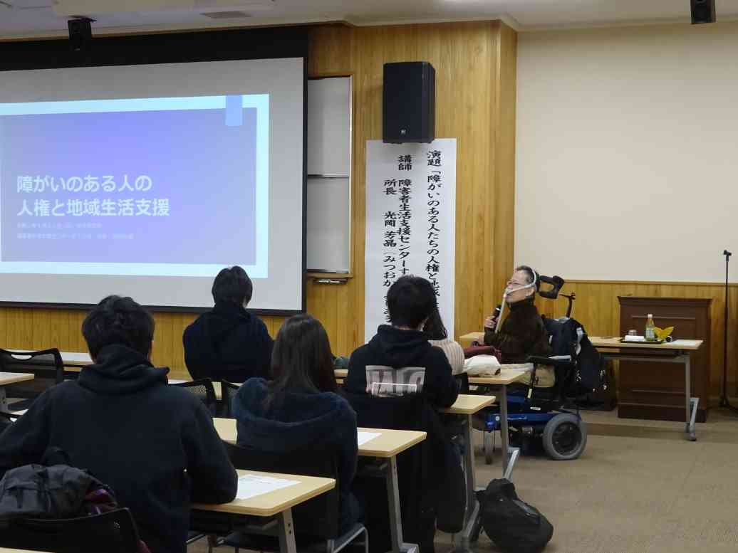 1月21日(火)講師に障害者生活支援センターすてっぷ所長 光岡芳晶さんを招いて、人権教育講演会を開催しました。障がいのある方が街で普通に生活できるように、行政に働きかけ自らNPO法人を立ち上げてこられた講師の経験談や若者へのメッセージを伺い、これから共生社会を担っていく若者としての自覚を持ちました。
