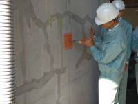 1つ目はクラックスケールを利用したひび割れ調査と鉄筋探査(RCレーダー)です。ひび割れ調査は表面のひび割れをチョークでなぞり、そのひび割れ幅を計測し、ひび割れの大きさや方向、その模様などから大まかなひび割れの大まかな原因を推定できます。鉄筋探査はコンクリート表面から非破壊で内部の鉄筋位置を確認し、鉄筋とひび割れの関連を調査するものです。