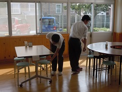ました。ダンスでしっかりと体を動かして、2チームに分かれてモップ掛けリレーを